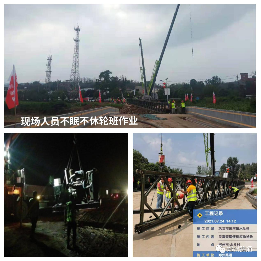 7月22日晚,路通公司緊急調(diào)派40余人及10余臺(tái)施工機(jī)械進(jìn)駐鞏義市米河鎮(zhèn)展開救援,班子成員親臨現(xiàn)場(chǎng)研究搶險(xiǎn)方案,施工人員不眠不休、輪班作業(yè)。為加快施工進(jìn)度,24日凌晨3點(diǎn),所有現(xiàn)場(chǎng)人員全體參與鋼架橋配件的卸車工作,當(dāng)前米河鎮(zhèn)水頭村水頭橋鋼便橋已拼裝完畢,計(jì)劃連夜完成安裝任務(wù),確保25日早橋上順利通車。