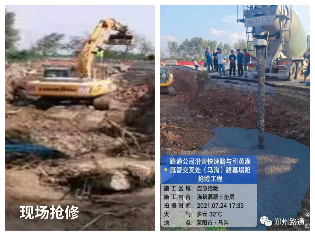 7月23日中午,路通公司接到指令,地處滎陽(yáng)的S312沿黃快速路與鄭焦高速互通立交西側(cè)匝道及沿黃快速路與其相連主體出現(xiàn)路基空洞,東西雙向完全斷行,要求搶修。路通公司下午即刻派駐18人,出動(dòng)六臺(tái)施工機(jī)械進(jìn)駐現(xiàn)場(chǎng)進(jìn)行搶修。截止7月24日下午,北半幅溝槽開挖完成,正在進(jìn)行管道基礎(chǔ)施工;南半幅臨時(shí)回填完成,已開放半幅雙向分流通行。