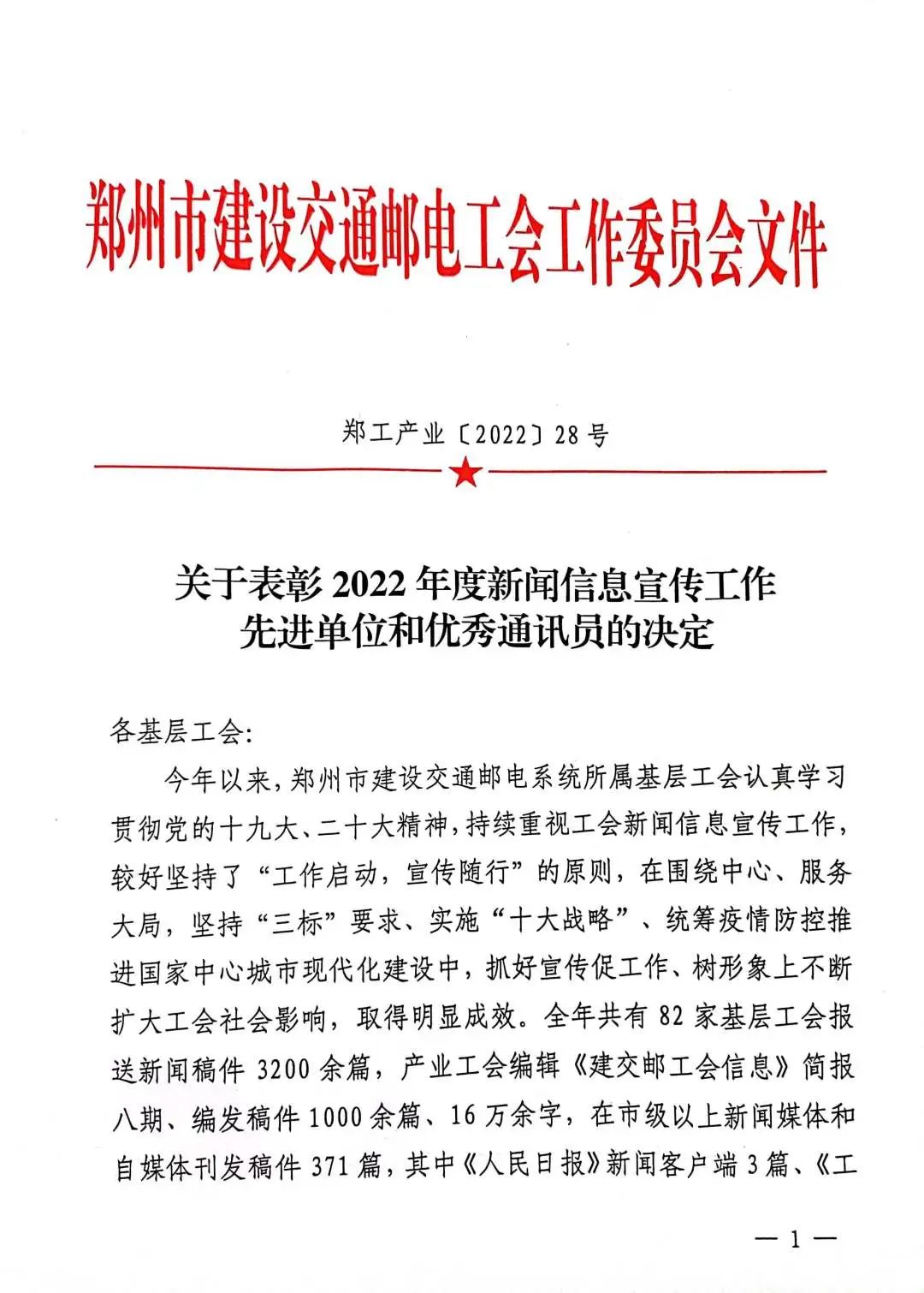 近日,鄭州市路通公路建設(shè)有限公司工會被鄭州市總工會交通郵電工會評為2022年度新聞信息宣傳工作先進單位。